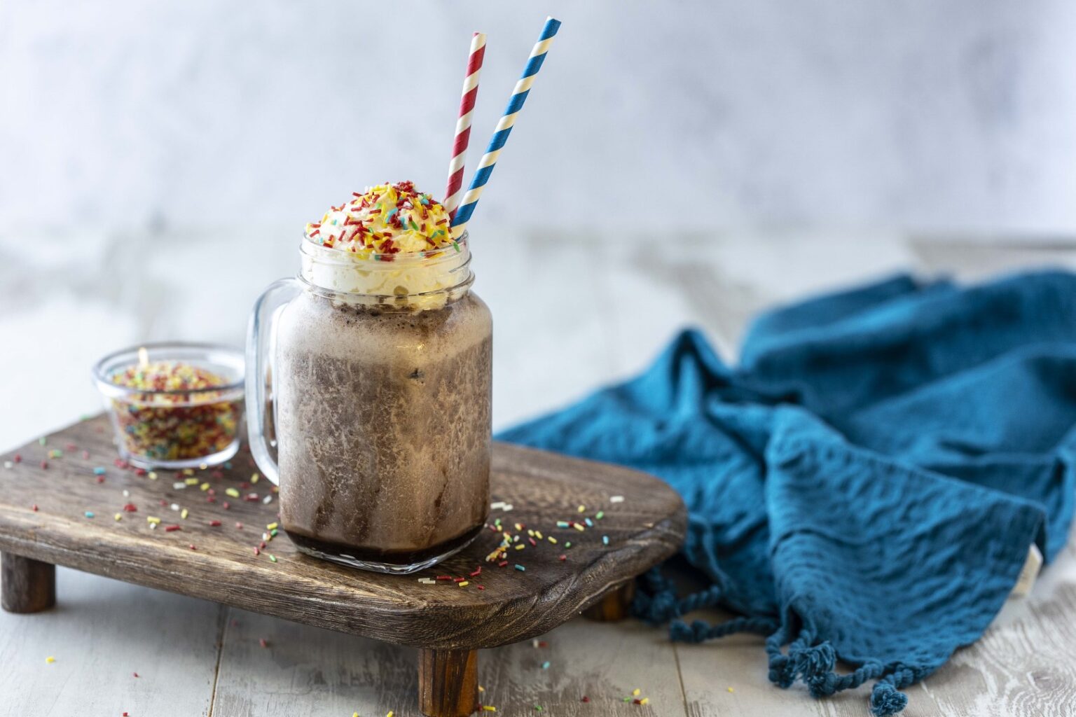 • Ρίχνουμε το μείγμα από τον κάδο του μπλέντερ στο ποτήρι, κάνουμε μια μεγάλη ροζέτα με την σαντιγί, πασπαλίζουμε με την πολύχρωμη τρούφα και σερβίρουμε με πολύχρωμο καλαμάκι.