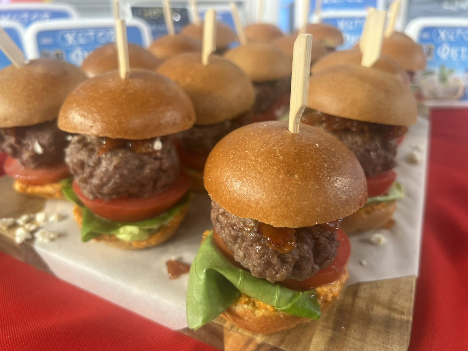 • Στα καπάκια του μπέργκερ μοιράζουμε τη μαγιονέζα, καπακώνουμε και καρφώνουμε με ένα ξυλάκι.