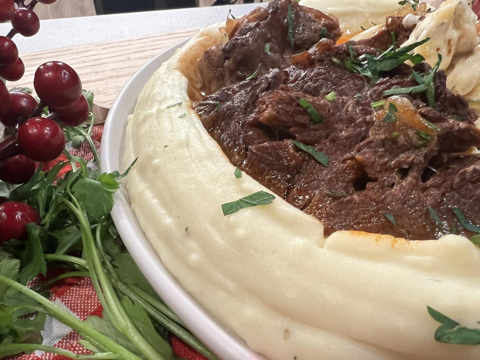 • Σε ένα ξύλο κοπής κόβουμε το μοσχάρι σε κομμάτια και αφαιρούμε το περιττό λίπος.