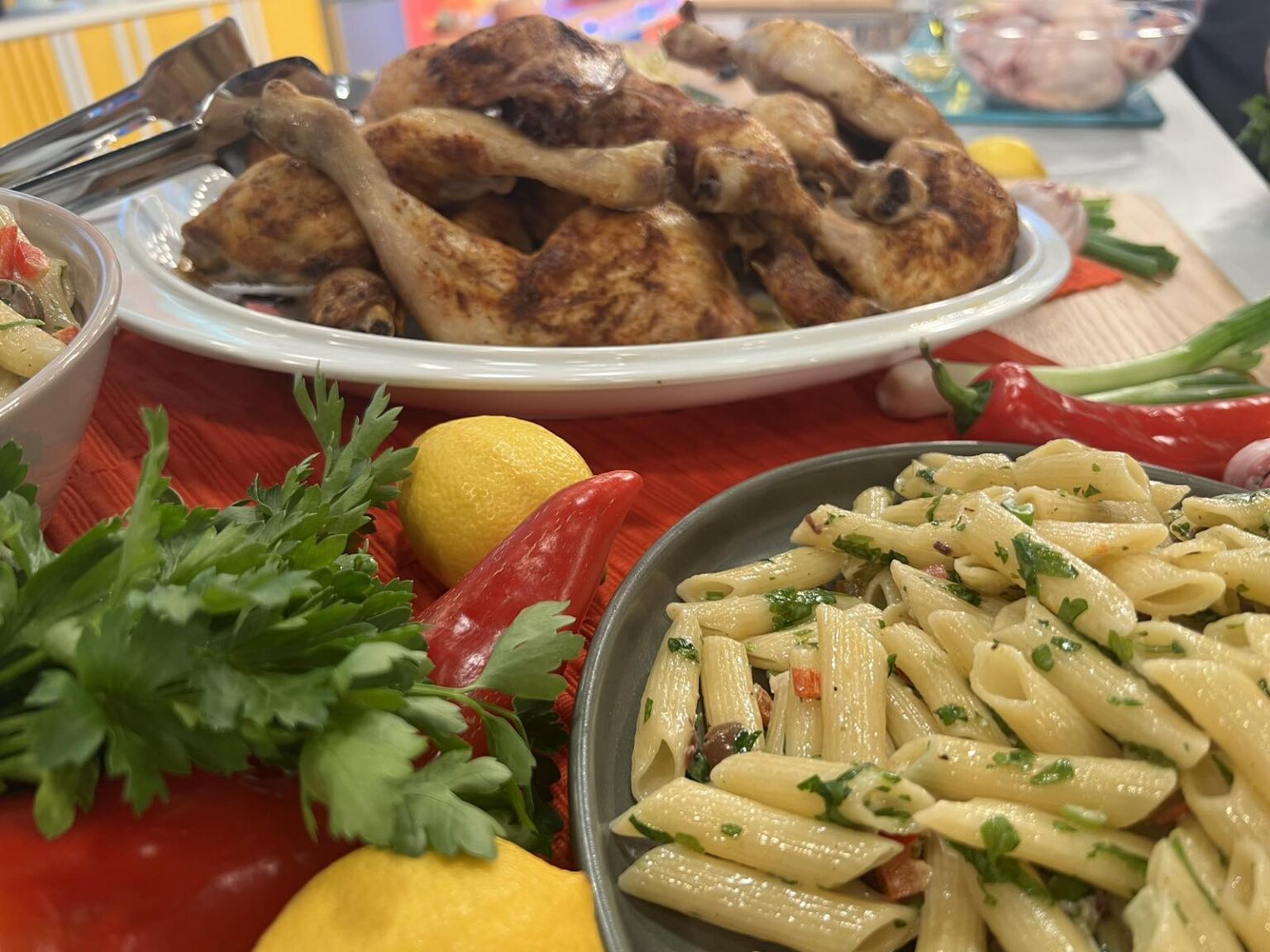 • Σε ένα ρηχό πιάτο σερβίρουμε τα μπούτια κοτόπουλο και τη μακαρονοσαλάτα σε ένα βαθύ μπολ.