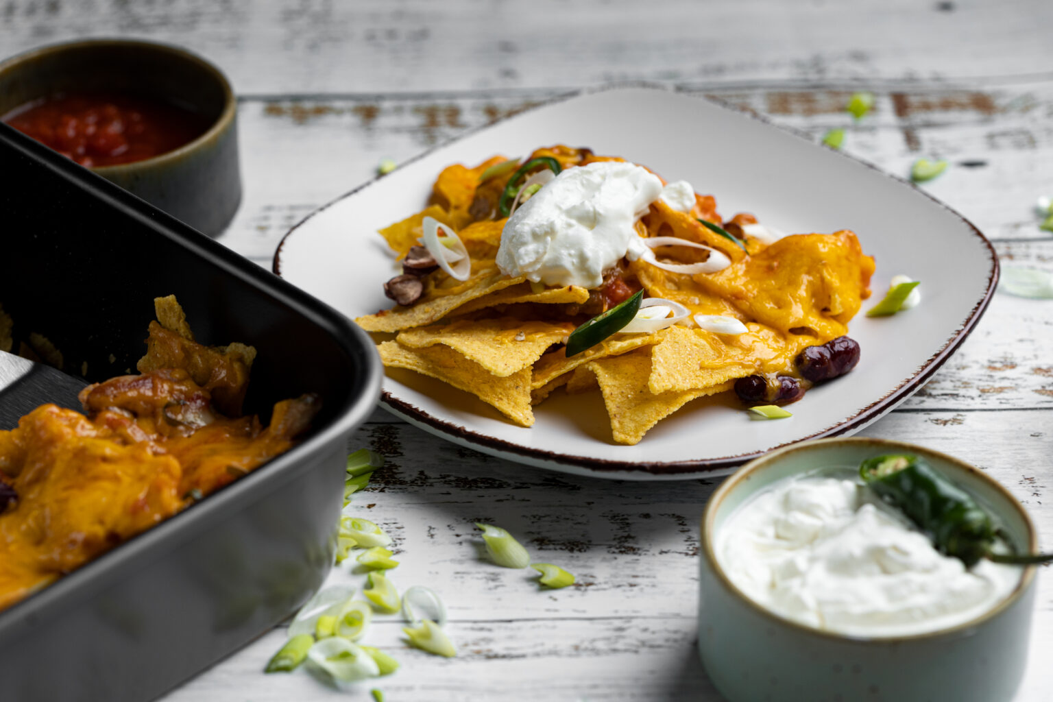 • Μόλις τα nachos με κοτόπουλο είναι έτοιμα, σερβίρουμε με τα υπόλοιπα φρέσκα κρεμμύδια και την καυτερή πιπεριά ψιλοκομμένα, και γιαούρτι.