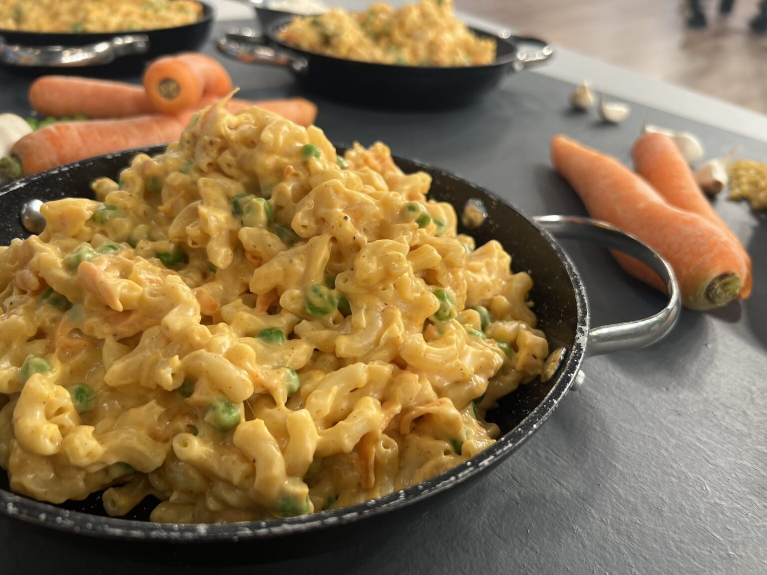 • Προσθέτουμε τα μακαρόνια, τον αρακά, το καρότο τριμμένο στην χοντρή μεριά του τρίφτη και ανακατεύουμε για ακόμα 3 λεπτά.