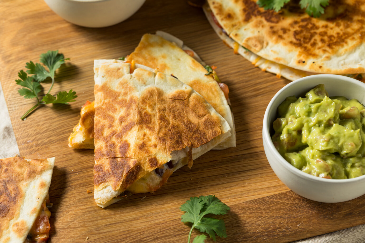 • Σερβίρουμε τις quesadillas κομμένες στη μέση με τη γουακαμόλε δίπλα.