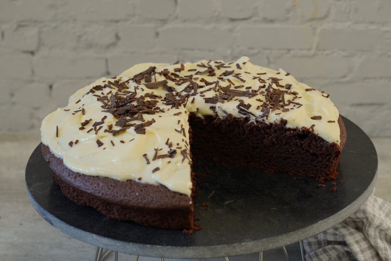• Σερβίρουμε το fudge κέικ σε ένα δίσκο σερβιρίσματος, απλώνουμε από πάνω την κρέμα ζαχαροπλαστικής και πασπαλίζουμε με τις νιφάδες κουβερτούρας.