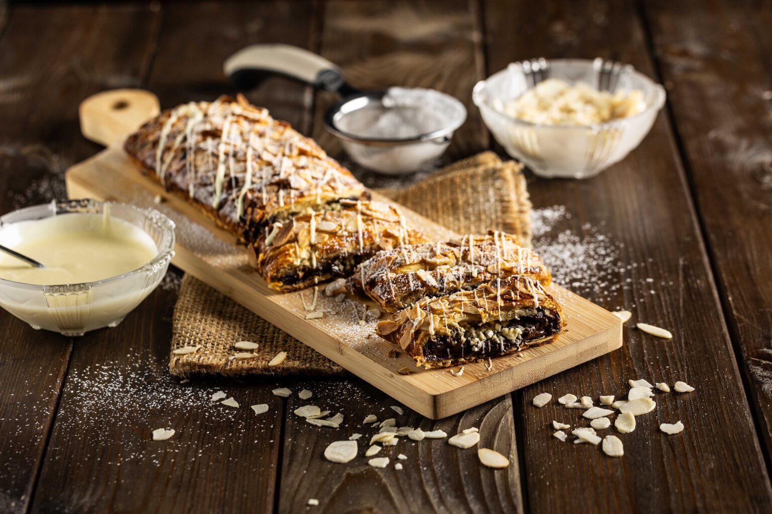 • Πασπαλίζουμε με φιλέ αμυγδάλου όλη την επιφάνεια του στρούντελ.