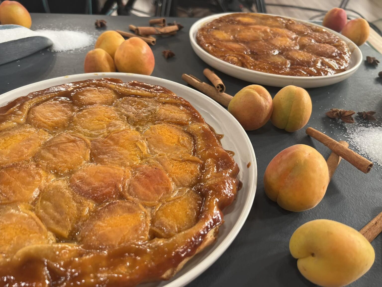 • Γυρίζουμε όλο το περιεχόμενο του τηγανιού μέσα στη φόρμα και τοποθετούμε τα βερίκοκα με την κομμένη πλευρά τους προς τα πάνω.