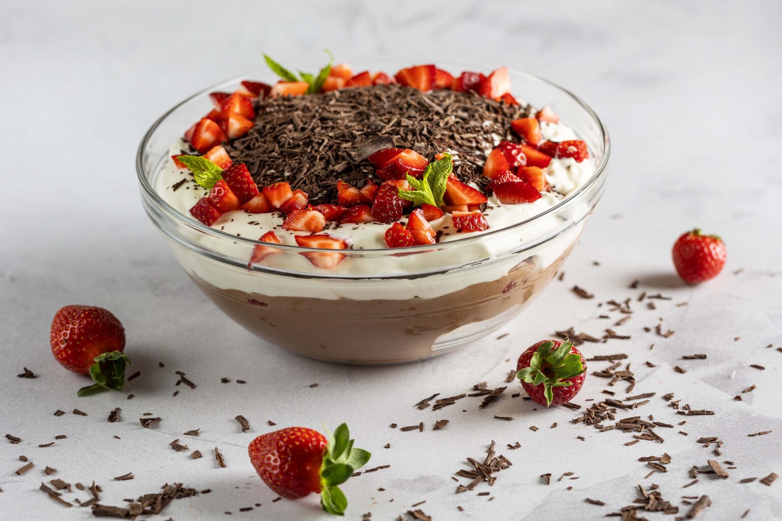 • Σε ένα γυάλινο μπολ 20cm ή σε ατομικά ποτήρια απλώνουμε μία στρώση από το μισό μπριος, μία στρώση από την κρέμα σοκολάτας, τις μισές φράουλες, αφού τις ψιλοκόψουμε, το υπόλοιπο μπριος, συνεχίζουμε με μία στρώση από την κρέμα γιαουρτιού, τις υπόλοιπες φράουλες κομμένες στα τέσσερα, τις νιφάδες κουβερτούρας και τελειώνουμε με τα φύλλα του δυόσμου.