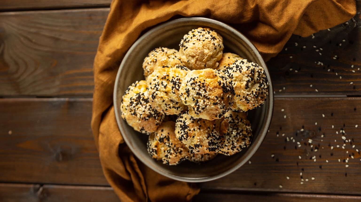 • Πλάθουμε 18 τυροψωμάκια των 30-35 γραμμαρίων και, πριν τα τοποθετήσουμε στο ταψί το ένα δίπλα στο άλλο, τα κυλάμε προαιρετικά σε σουσάμι, ώστε να κολλήσει ομοιόμορφα γύρω τους.