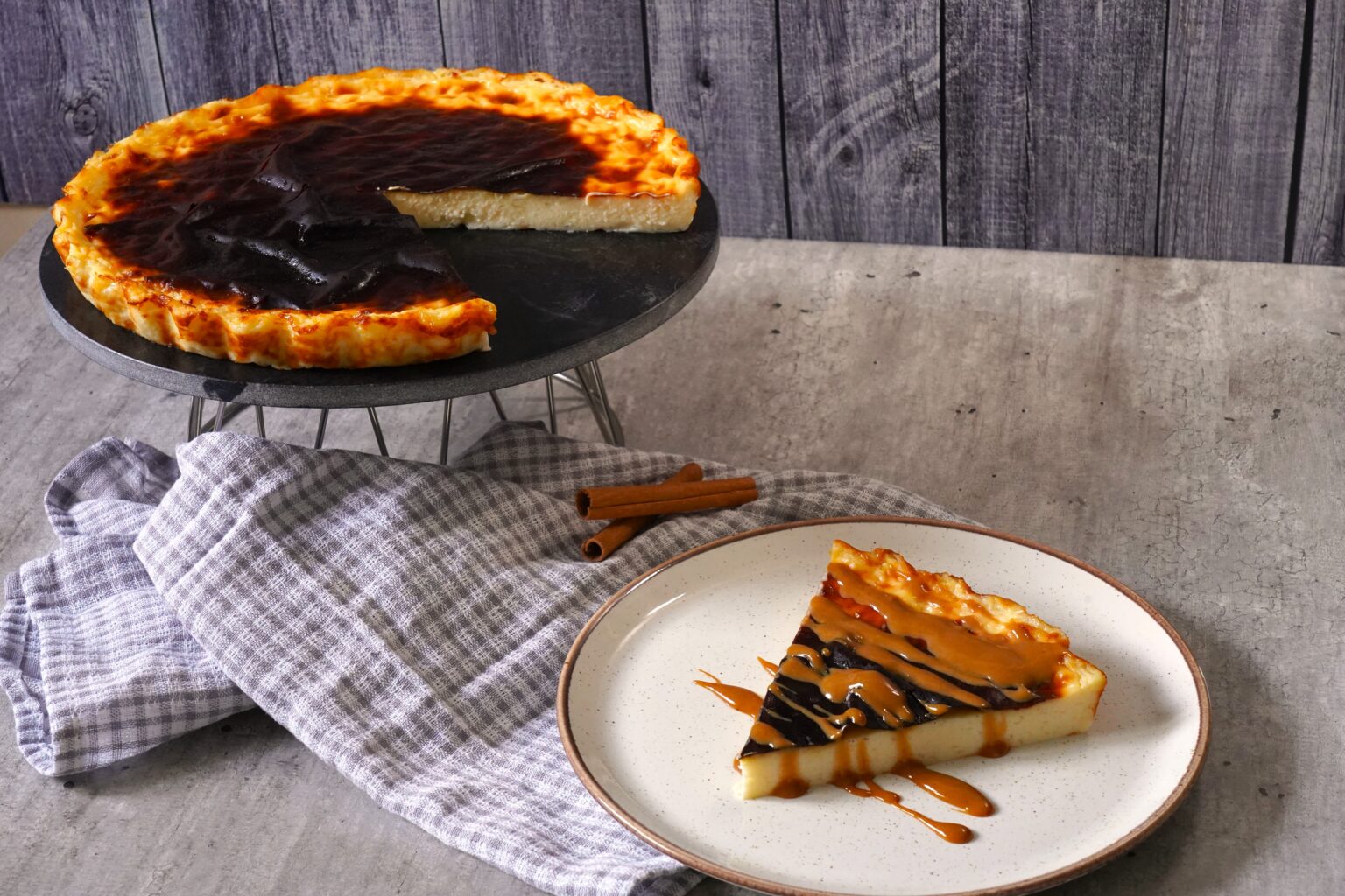 • Βγάζουμε από το ψυγείο τη γαλατόπιτα, κόβουμε σε κομμάτια και γαρνίρουμε με μπόλικη αλμυρή καραμέλα από πάνω.