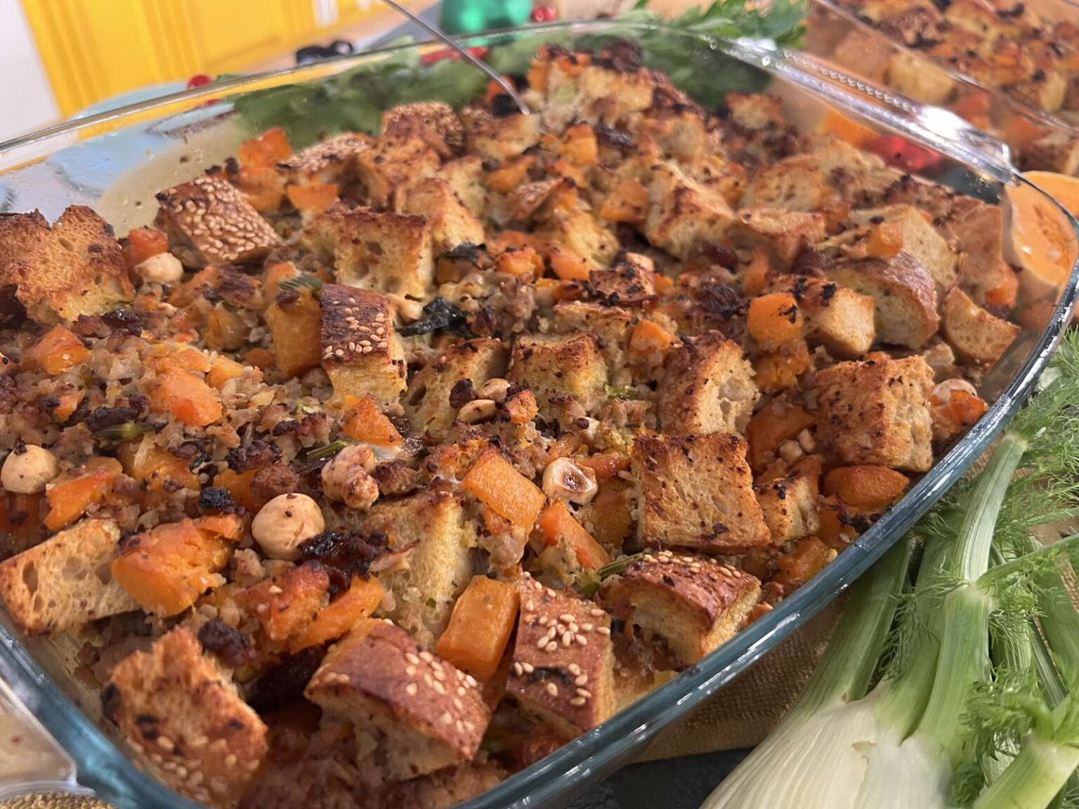 • Μεταφέρουμε τον κιμά από το τηγάνι στη μία άκρη ενός ταψιού 33x28 εκ. , την ψημένη κολοκύθα στη μέση και στην άλλη άκρη το ψωμί σε κομμάτια. Απλώνουμε επάνω από τα υλικά τις σταφίδες, τα φουντούκια και ανακατεύουμε με μια ξύλινη κουτάλα.